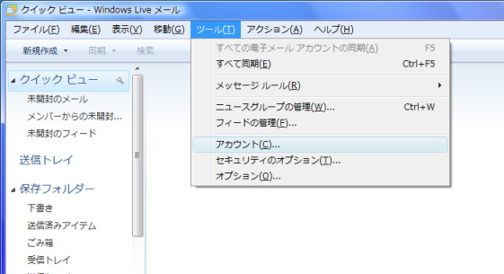 2.「Windows Live メール」が起動しましたら、メニューより「ツール(T)」をクリックし、「アカウント(C)」を選択します。(メニューが隠れている場合は、キーボードの「Alt」キーを押すとメニューが表示されます。)